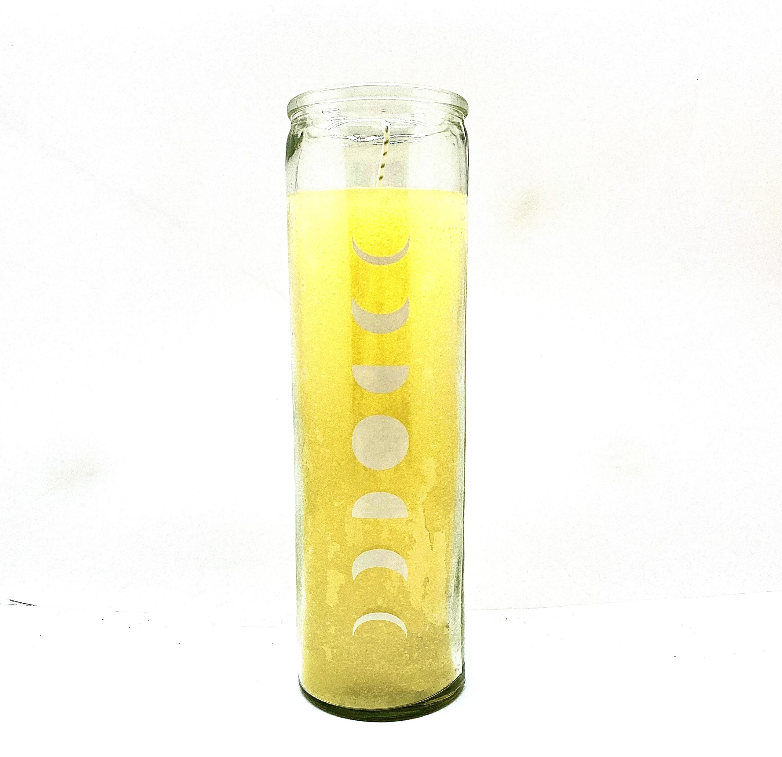 The white Moon atop a bright yellow candle will keep you positive and on track during the Solstice and in the days to follow. Yellow wax with white moons in various phases.